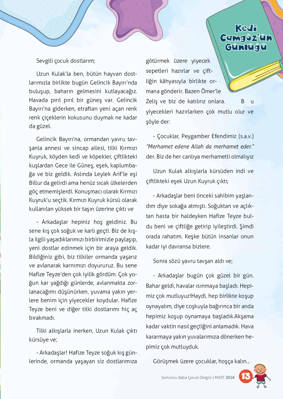 Sevgili çocuk dostlarım;Uzun Kulak’la ben, bütün hayvan dostlarımızla birlikte bugün Gelincik Bayırı’nda buluşup, baharın gelmesini kutlayacağız. Havada pırıl pırıl bir güneş var. Gelincik Bayırı’na giderken, etraftan yeni açan renk renk çiçeklerin kokusunu duymak ne kadar...