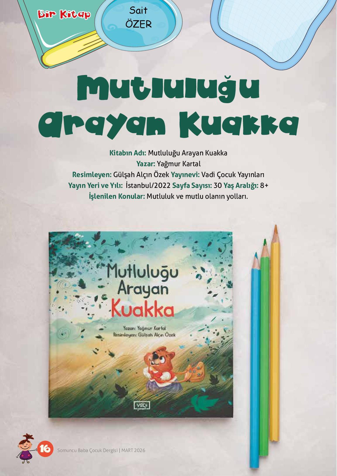 Kitabın Adı: Mutluluğu Arayan KuakkaYazar: Yağmur KartalResimleyen: Gülşah Alçın ÖzekYayınevi: Vadi Çocuk YayınlarıYayın Yeri ve Yılı: İstanbul/2022Sayfa Sayısı: 30Yaş aralığı: 8+İşlenen Konular: Mutluluk ve mutlu olanın yolları.Sevgili çocuklar isterseniz kitabımıza geçmeden ...