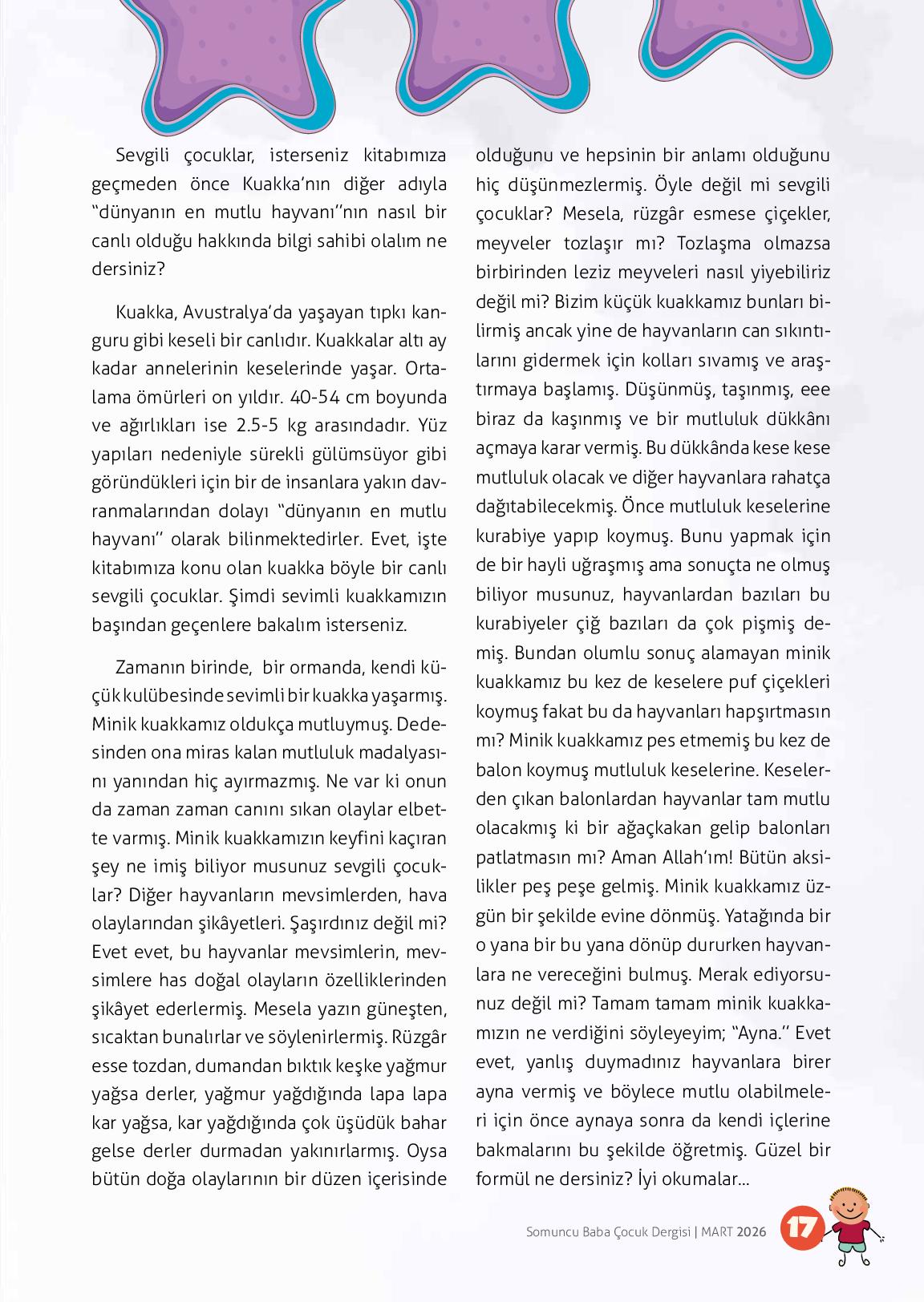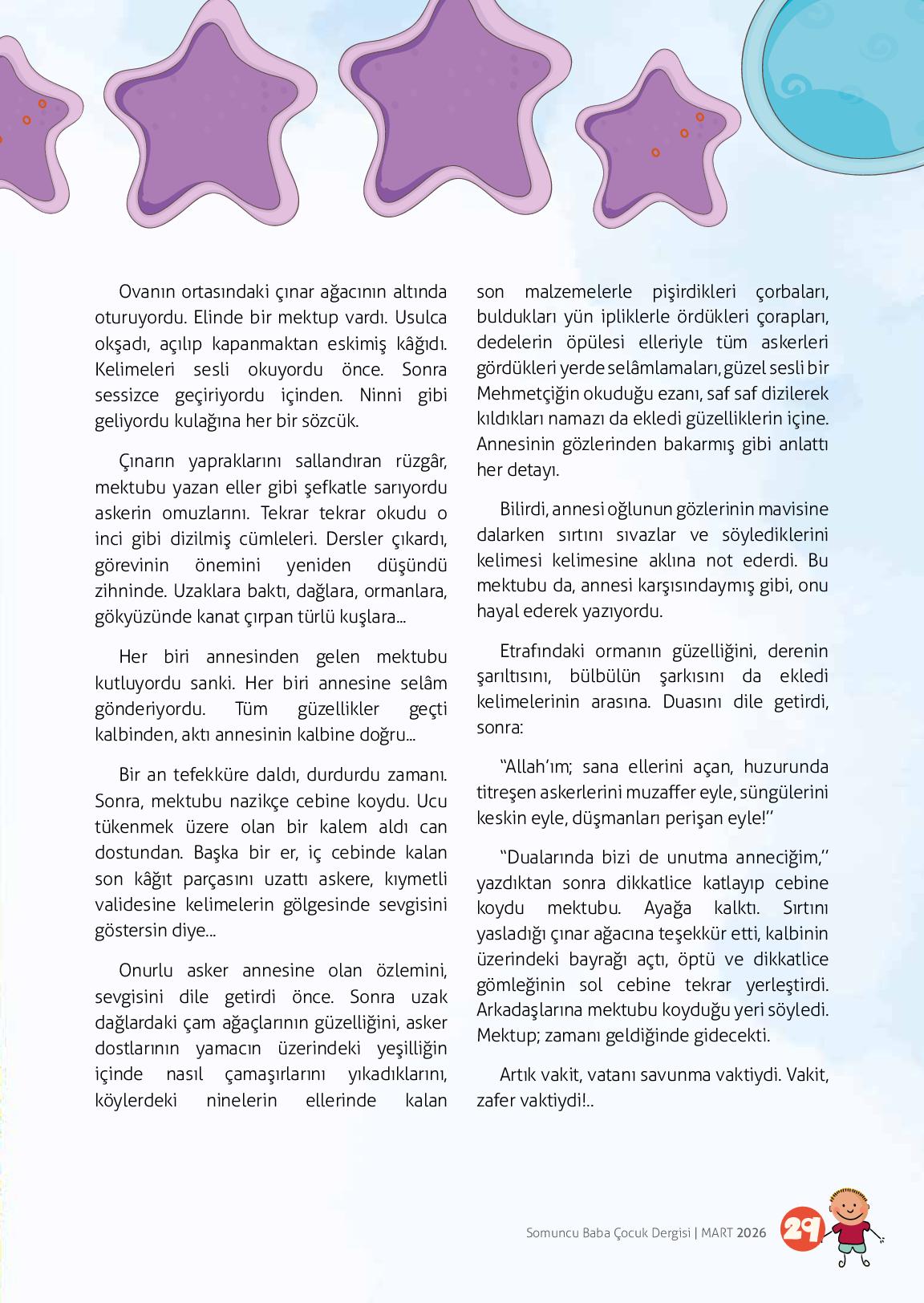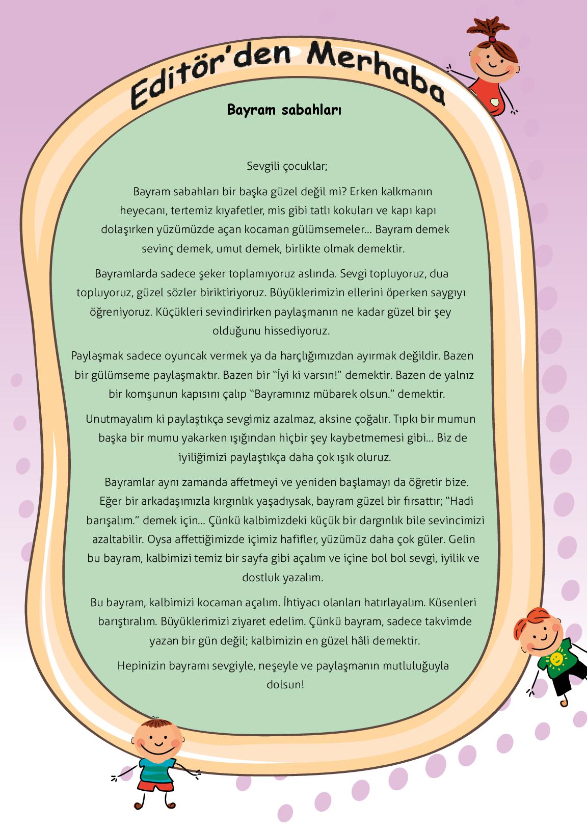 Sevgili çocuklar;Bayram sabahları bir başka güzel değil mi? Erken kalkmanın heyecanı, tertemiz kıyafetler, mis gibi tatlı kokuları ve kapı kapı dolaşırken yüzümüzde açan kocaman gülümsemeler… Bayram demek sevinç demek, umut demek, birlikte olmak demektir.Bayramlarda sadece şeker toplamı...