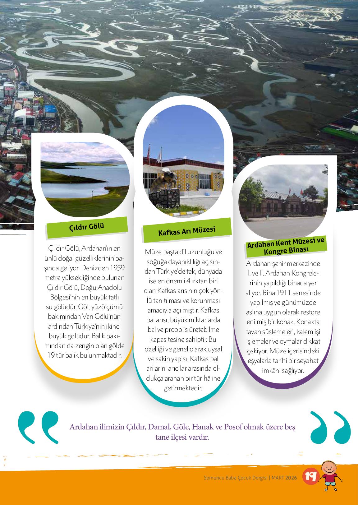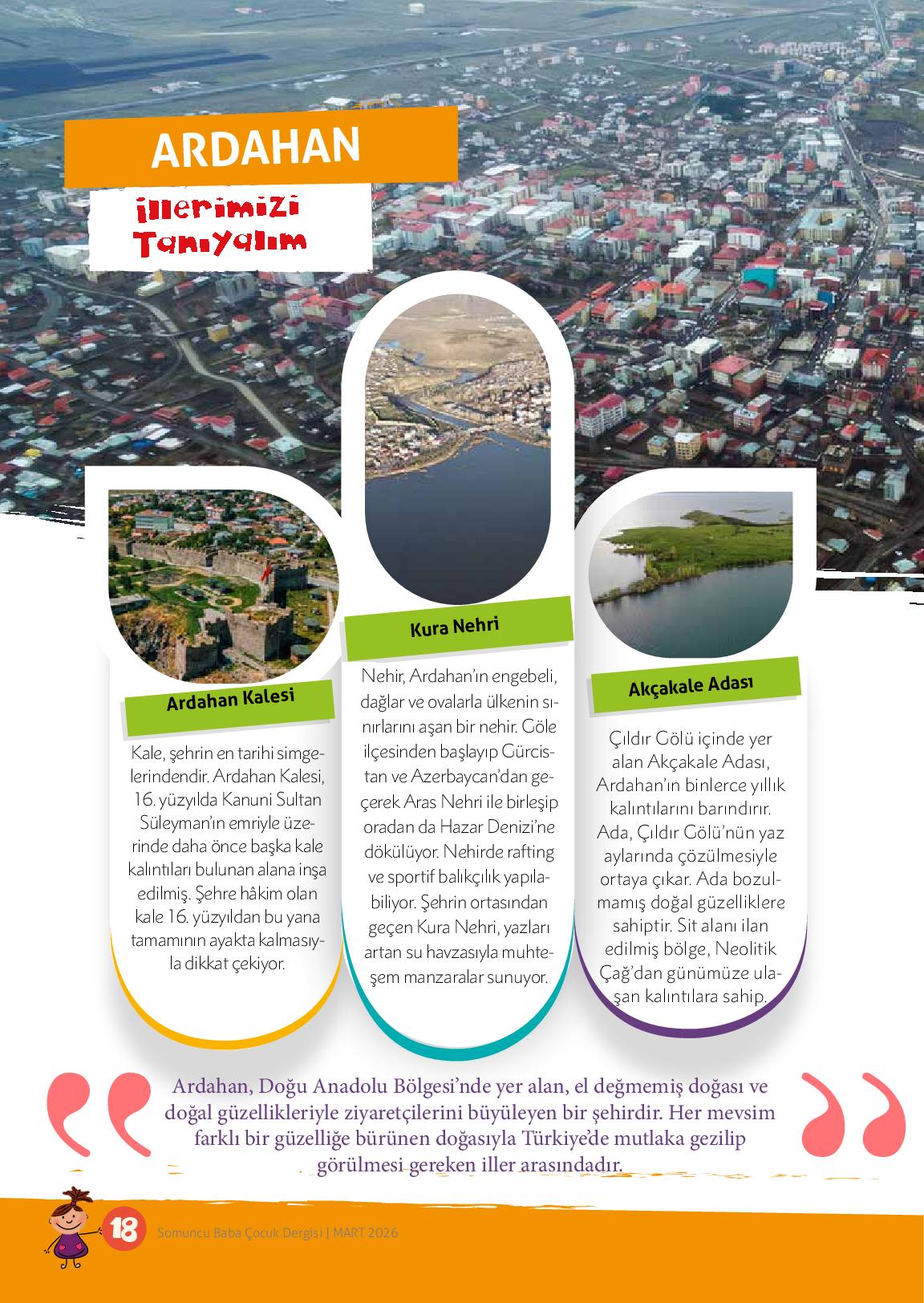 “Ardahan, Doğu Anadolu Bölgesi’nde yer alan, el değmemiş doğası ve doğal güzellikleriyle ziyaretçilerini büyüleyen bir şehirdir. Her mevsim farklı bir güzelliğe bürünen doğasıyla Türkiye’de mutlaka gezilip görülmesi gereken iller arasındadır. Doğal güzellikleri, tarihi alanları, Kura Nehri ve...