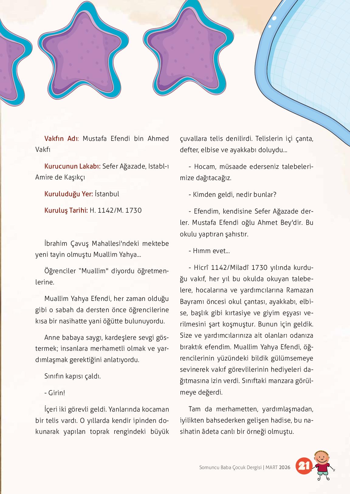 Vakfın Adı: Mustafa Efendi bin Ahmed VakfıKurucunun Lakabı: Sefer Ağazade, Istabl-ı Amire de KaşıkçıKuruluduğu Yer: İstanbulKuruluş Tarihi: H. 1142/M. 1730İbrahim Çavuş Mahallesi'ndeki mektebe yeni tayin olmuştu Muallim Yahya...Öğrenciler “Muallim" diyo...