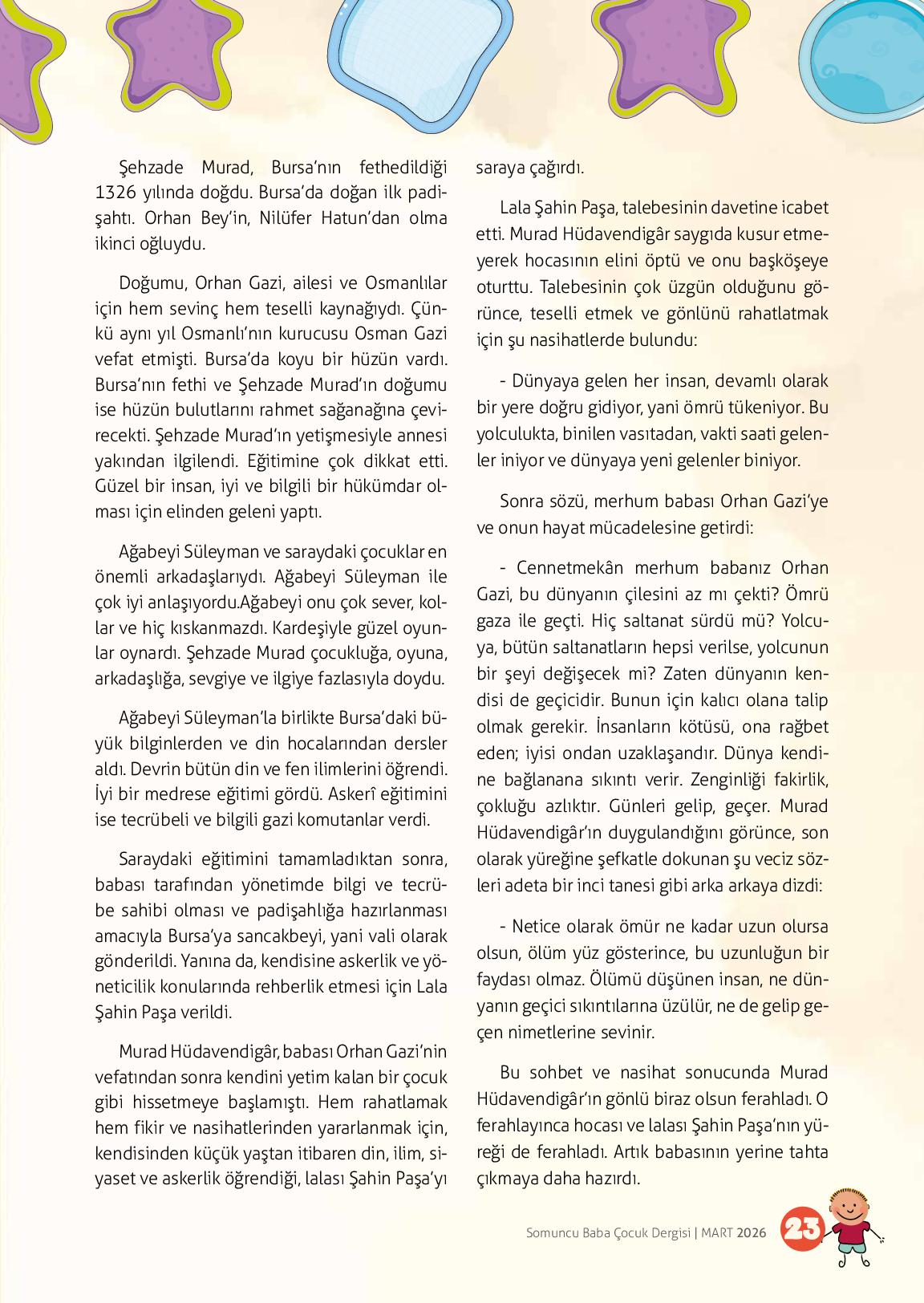 Şehzade Murad, Bursa’nın fethedildiği 1326 yılında doğdu. Bursa’da doğan ilk padişahtı. Orhan Bey’in, Nilüfer Hatun’dan olma ikinci oğluydu.Doğumu, Orhan Gazi, ailesi ve Osmanlılar için hem sevinç hem teselli kaynağıydı. Çünkü aynı yıl Osmanlı’nın kurucusu Osman Gazi vefat etmişt...