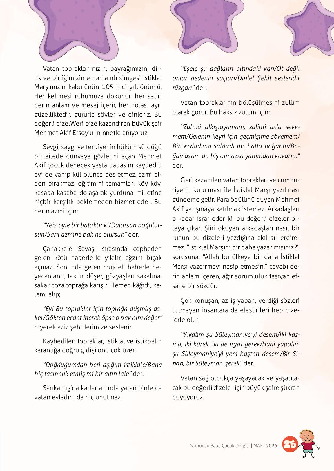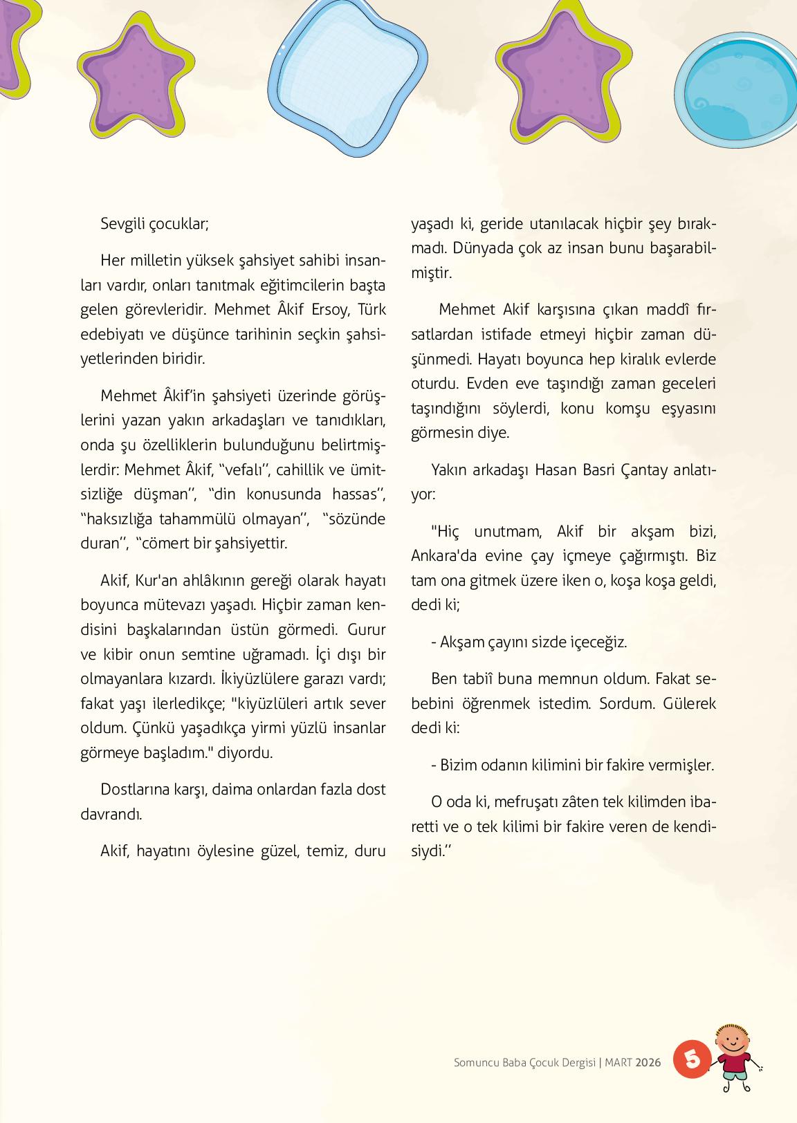 Sevgili çocuklarHer milletin yüksek şahsiyet sahibi insanları vardır, onları tanıtmak eğitimcilerin başta gelen görevleridir. Mehmet Âkif Ersoy, Türk edebiyatı ve düşünce tarihinin seçkin şahsiyetlerinden biridir. &...