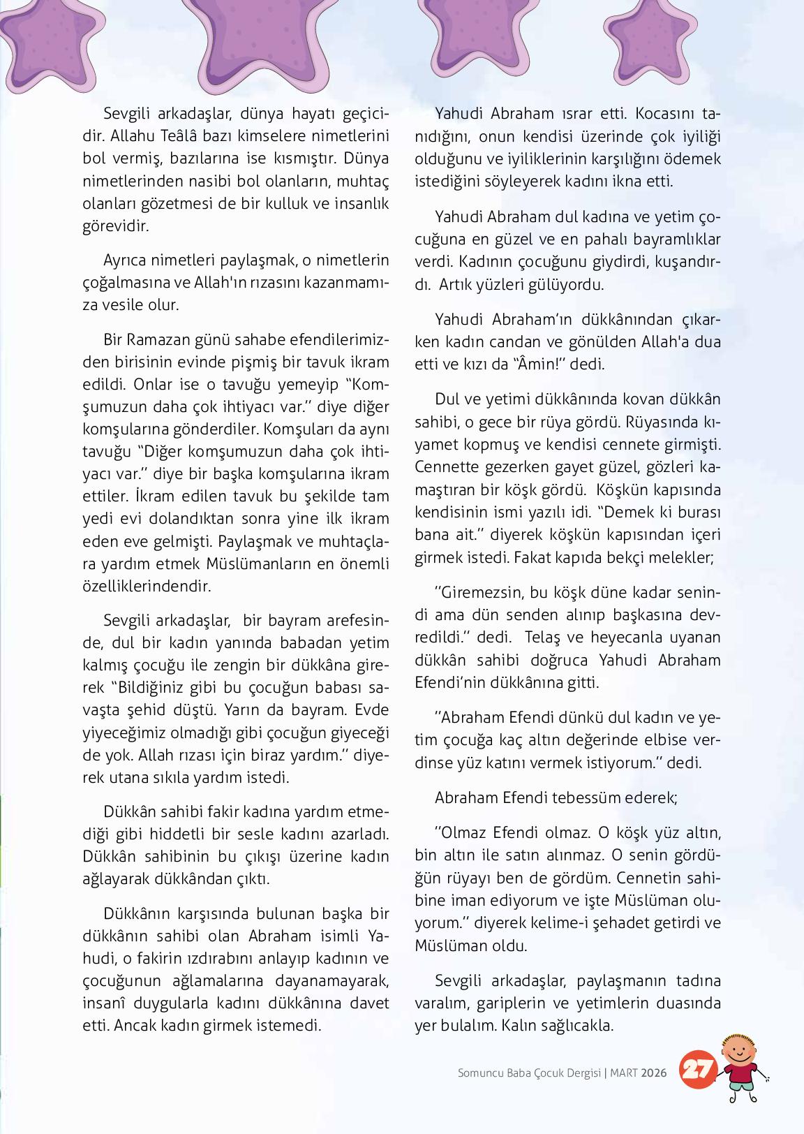 Sevgili arkadaşlar, dünya hayatı geçicidir. Allahu Teâlâ bazı kimselere nimetlerini bol vermiş, bazılarına ise kısmıştır. Dünya nimetlerinden nasibi bol olanların, muhtaç olanları gözetmesi de bir kulluk ve insanlık görevidir.Ayrıca nimetleri paylaşmak, o nimetlerin çoğalmasına ve Al...