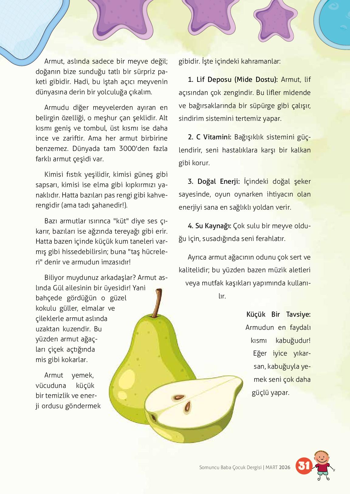 Armut, aslında sadece bir meyve değil; doğanın bize sunduğu tatlı bir sürpriz paketi gibidir. Hadi, bu iştah açıcı meyvenin dünyasına derin bir yolculuğa çıkalım.Armudu diğer meyvelerden ayıran en belirgin özelliği, o meşhur çan şeklidir. Alt kısmı geniş ve tombul, üst kısmı ise daha ince ve za...