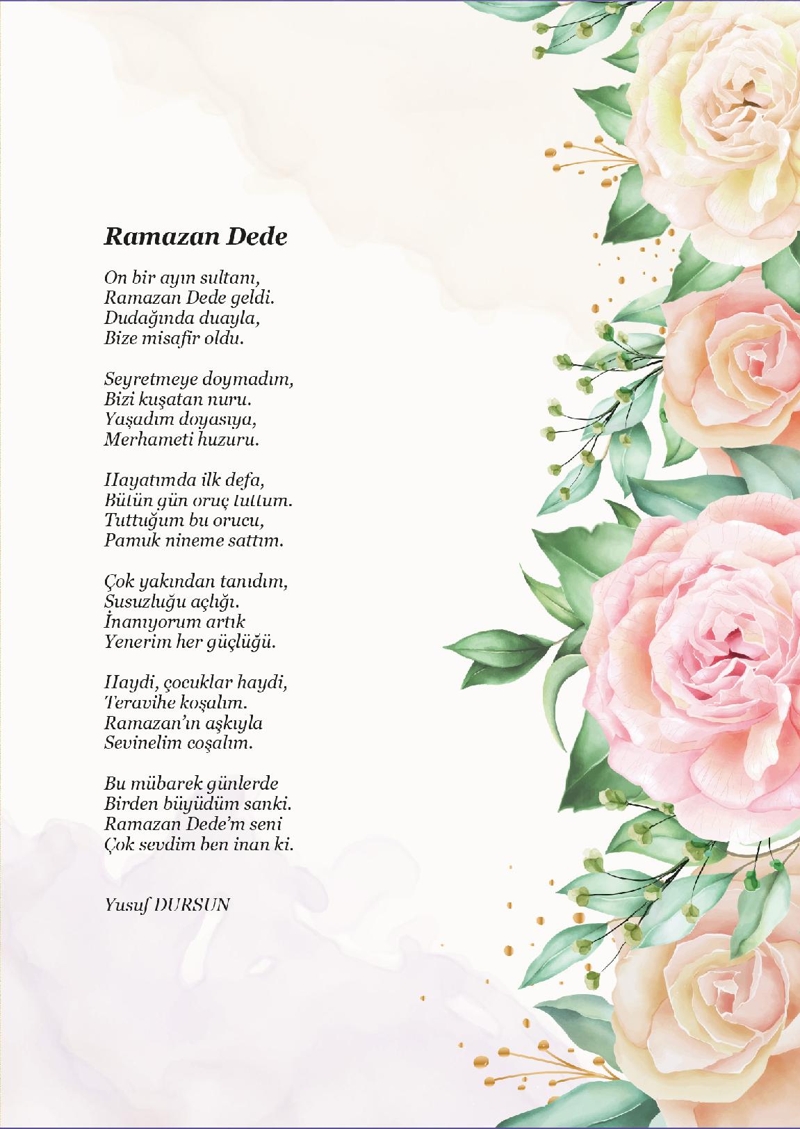 On bir ayın sultanı,Ramazan Dede geldi.Dudağında duayla,Bize misafir oldu.Seyretmeye doymadım,Bizi kuşatan nuru.Yaşadım doyasıya,Merhameti huzuru.Hayatımda ilk defa,Bütün gün oruç tuttum.Tuttuğum bu orucu,Pamuk nineme sattım.Çok yakından tanıdım,Susuzluğu açlığı.İnanıyorum artıkYenerim h...