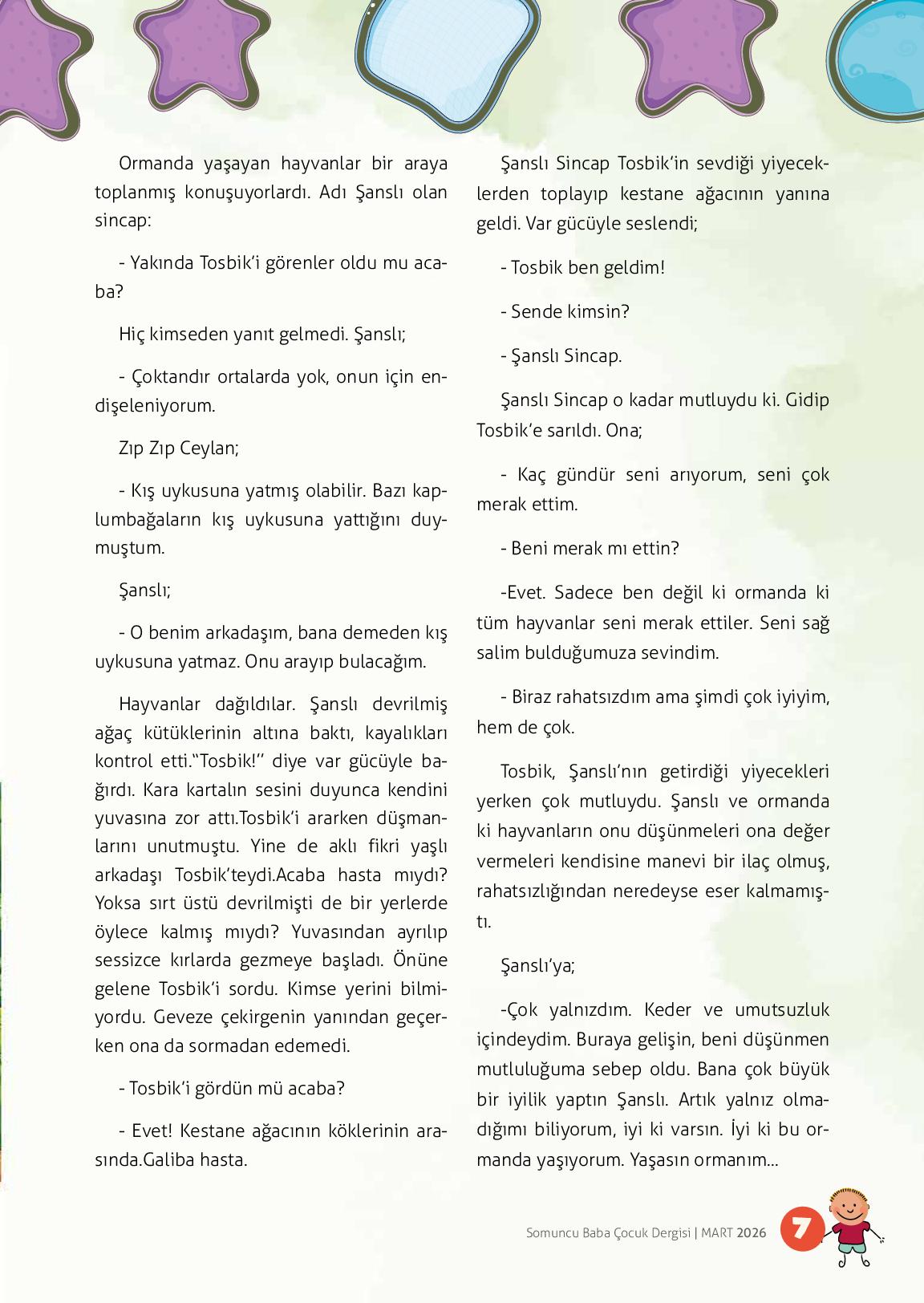 Ormanda yaşayan hayvanlar bir araya toplanmış konuşuyorlardı. Adı Şanslı olan sincap:- Yakında Tosbik’i görenler oldu mu acaba?Hiç kimseden yanıt gelmedi. Şanslı;- Çoktandır ortalarda yok, onun için endişeleniyorum.Zıp Zıp Ceylan;- Kış uykusuna yatmış olabilir. Bazı kaplumbağ...