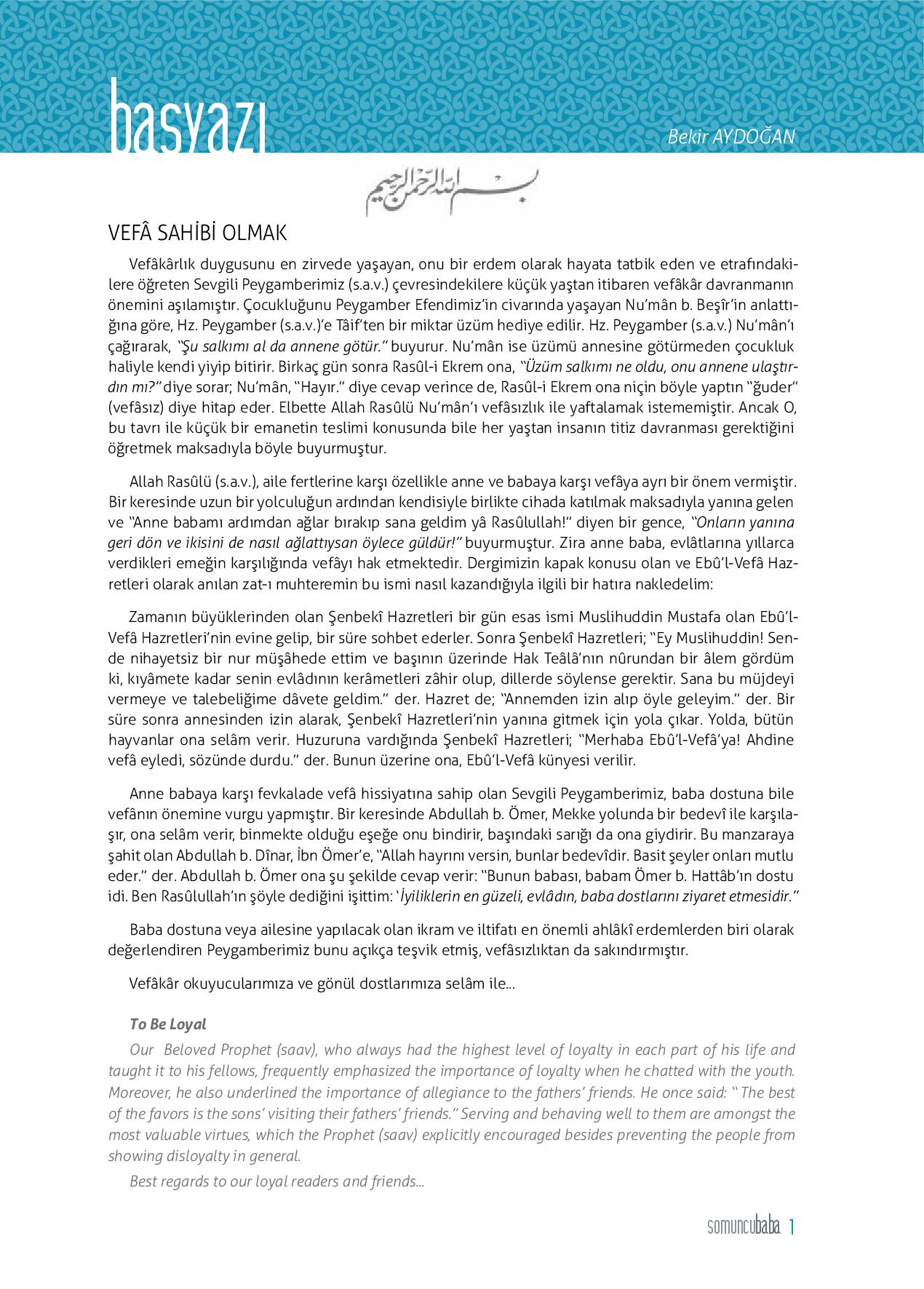 Vefâkârlık duygusunu en zirvede yaşayan, onu bir erdem olarak hayata tatbik eden ve etrafındakilere öğreten Sevgili Peygamberimiz (s.a.v.) çevresindekilere küçük yaştan itibaren vefâkâr davranmanın önemini aşılamıştır. Çocukluğunu Peygamber Efendimiz’in civarında yaşayan Nu’mân b. B...