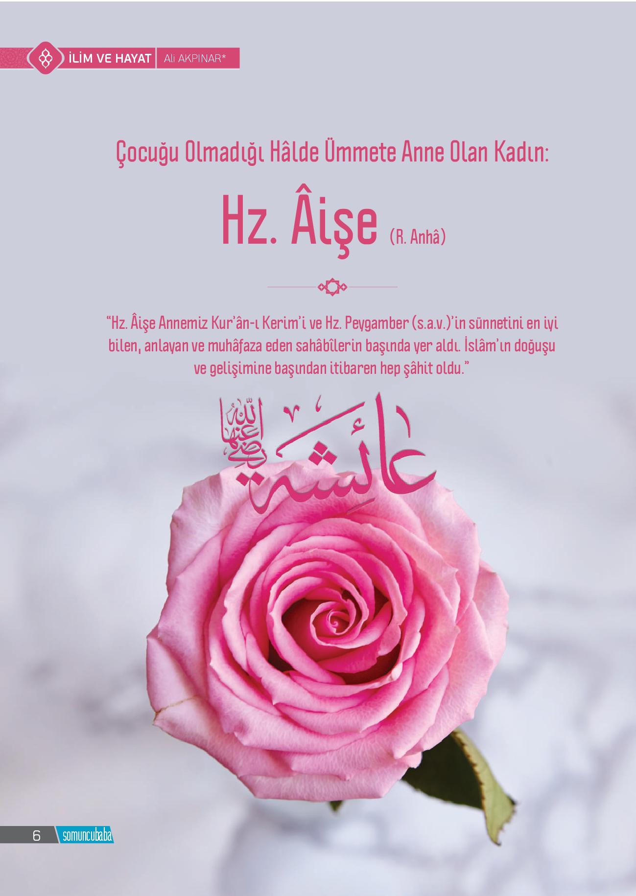 Peygamberimiz (s.a.v.)’in sevgili eşi, Hz. Ebu Bekir’in kızı, mü’minlerin annesi, Yüce Allah’ın âyetleriyle tezkiye ettiği iffet âbidesi, en çok hadis (2210 hadis) rivâyet eden anne, hayatında ve vefâtından sonra evinde Hz. Peygamber (s...