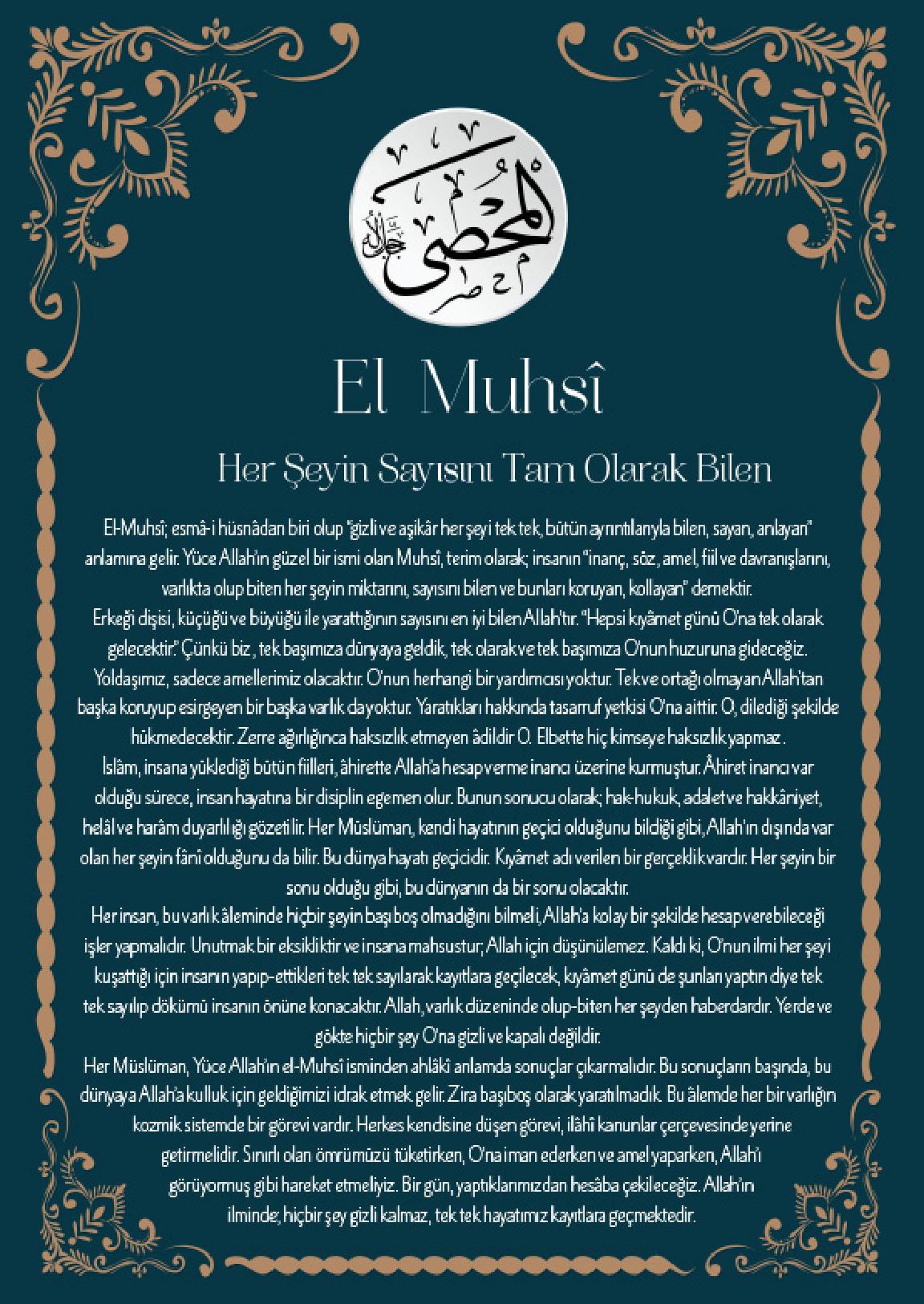El-Muhsî: Bütün Ayrıntıları ve Tek Tek Her Şeyin Sayısını Tam Olarak BilenEl-Muhsî; esmâ-i hüsnâdan biri olup “gizli ve aşikâr her şeyi tek tek, bütün ayrıntılarıyla bilen, sayan, anlayan” anlamına gelir. Yüce Allah’ın güzel bir ismi olan Muhsî, terim olarak; insanın “inanç, s...